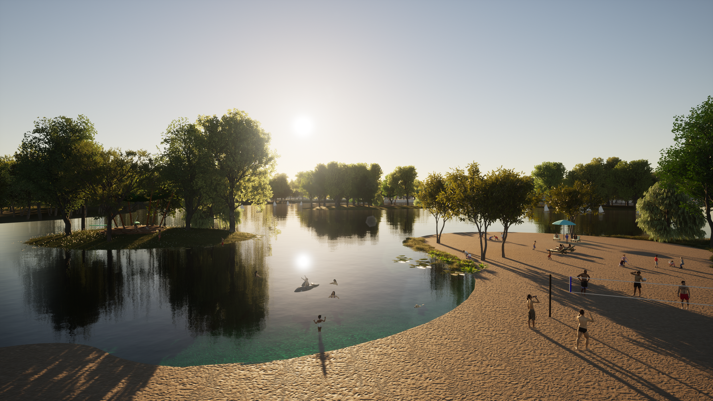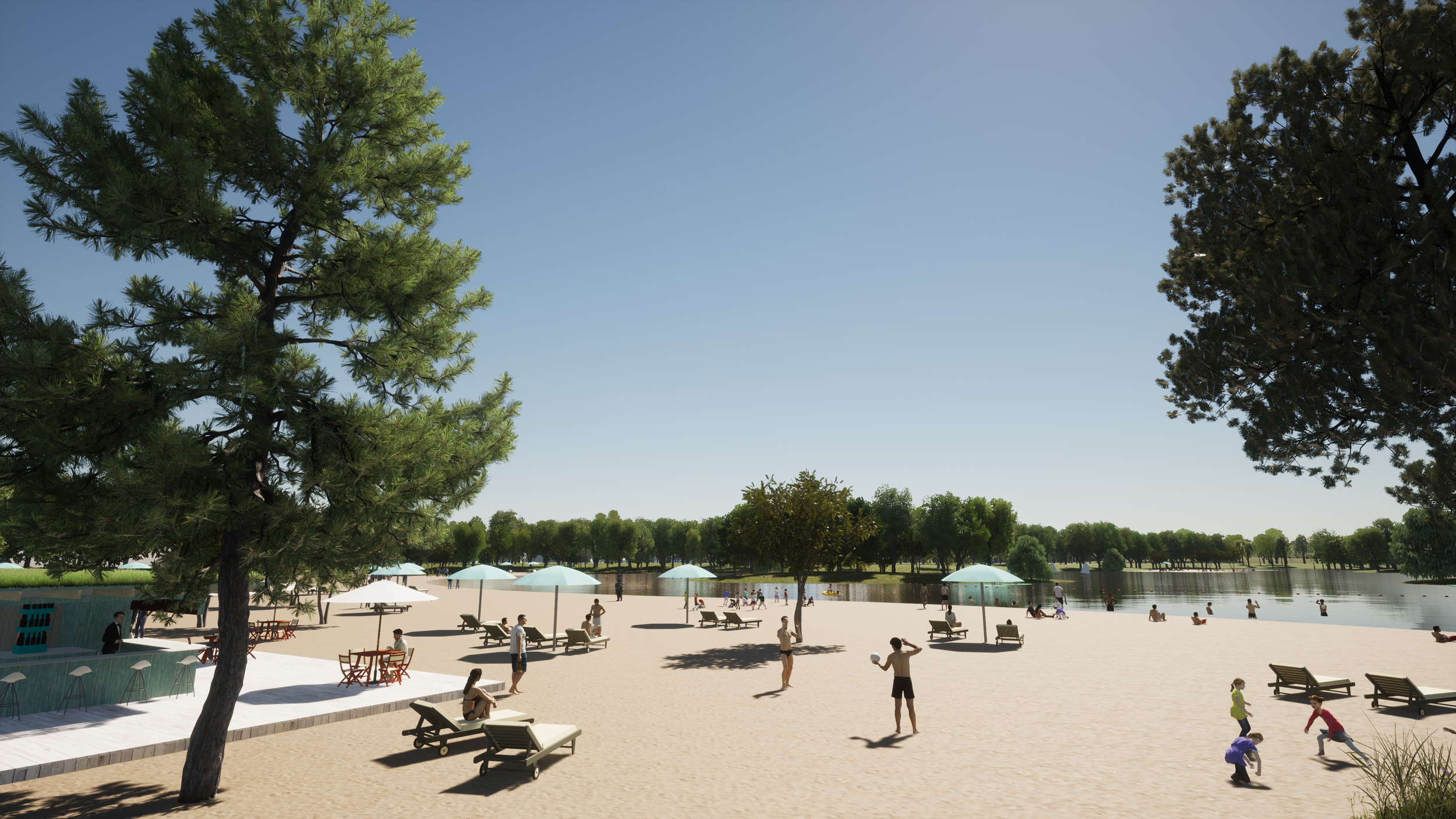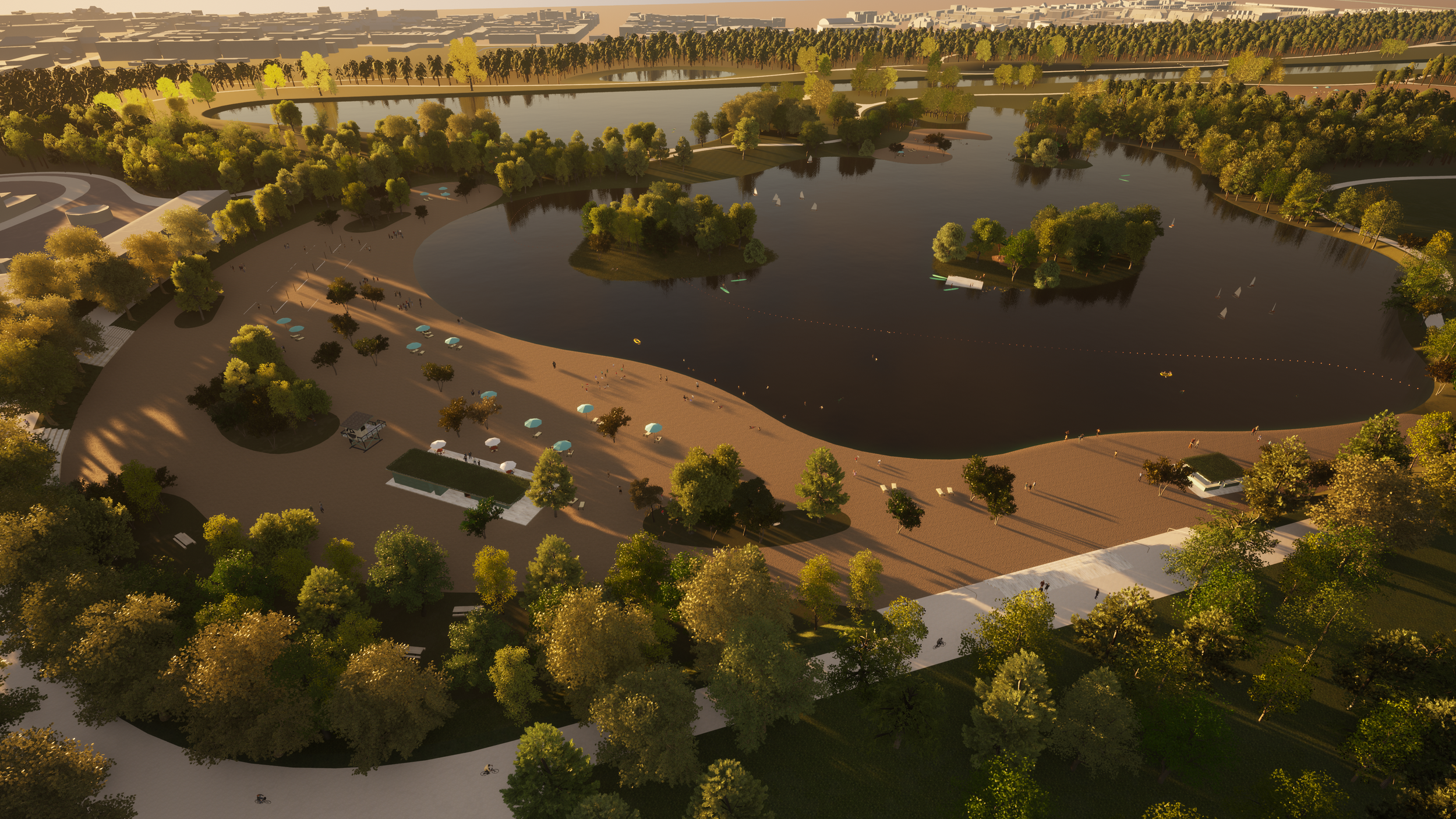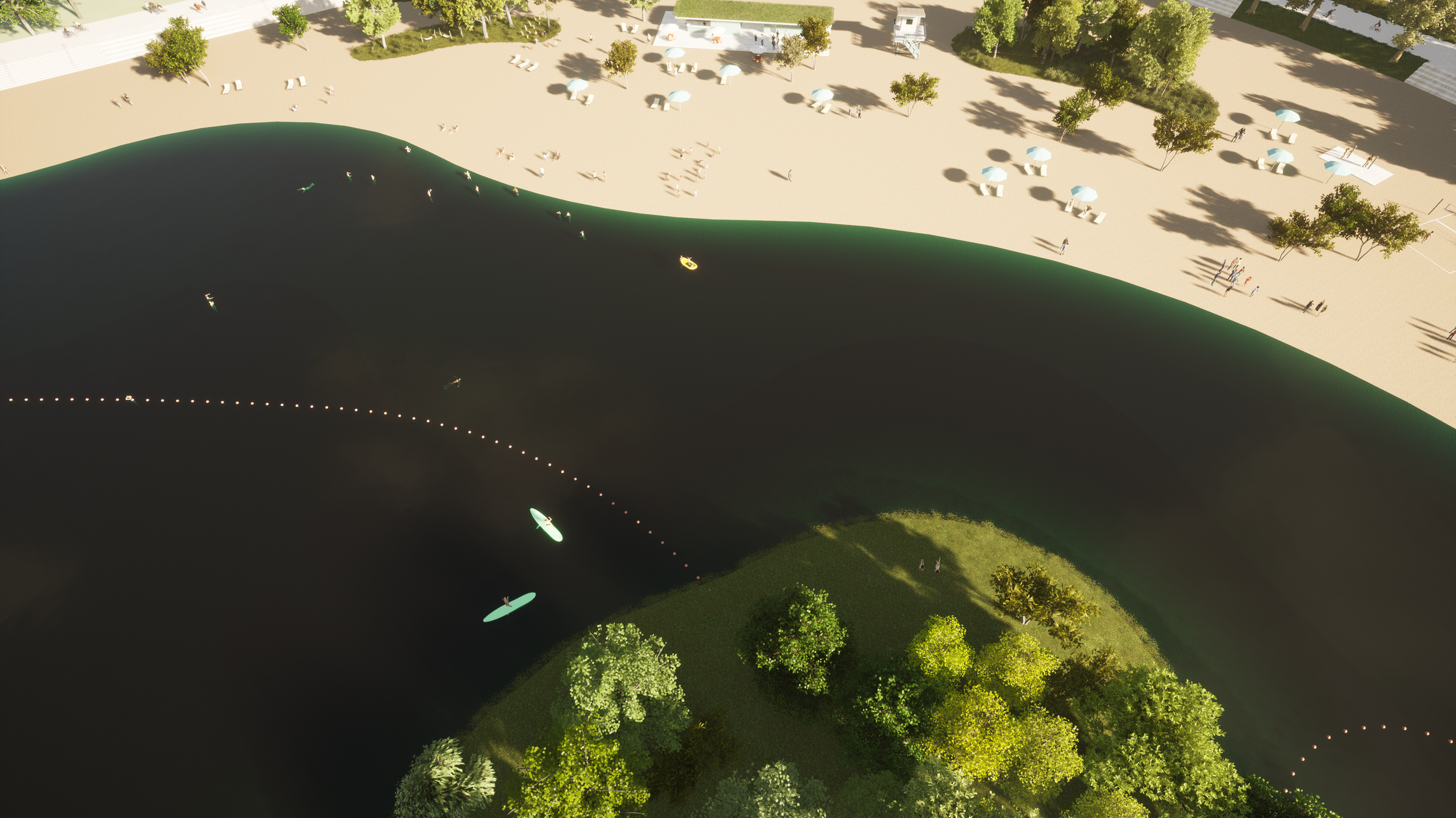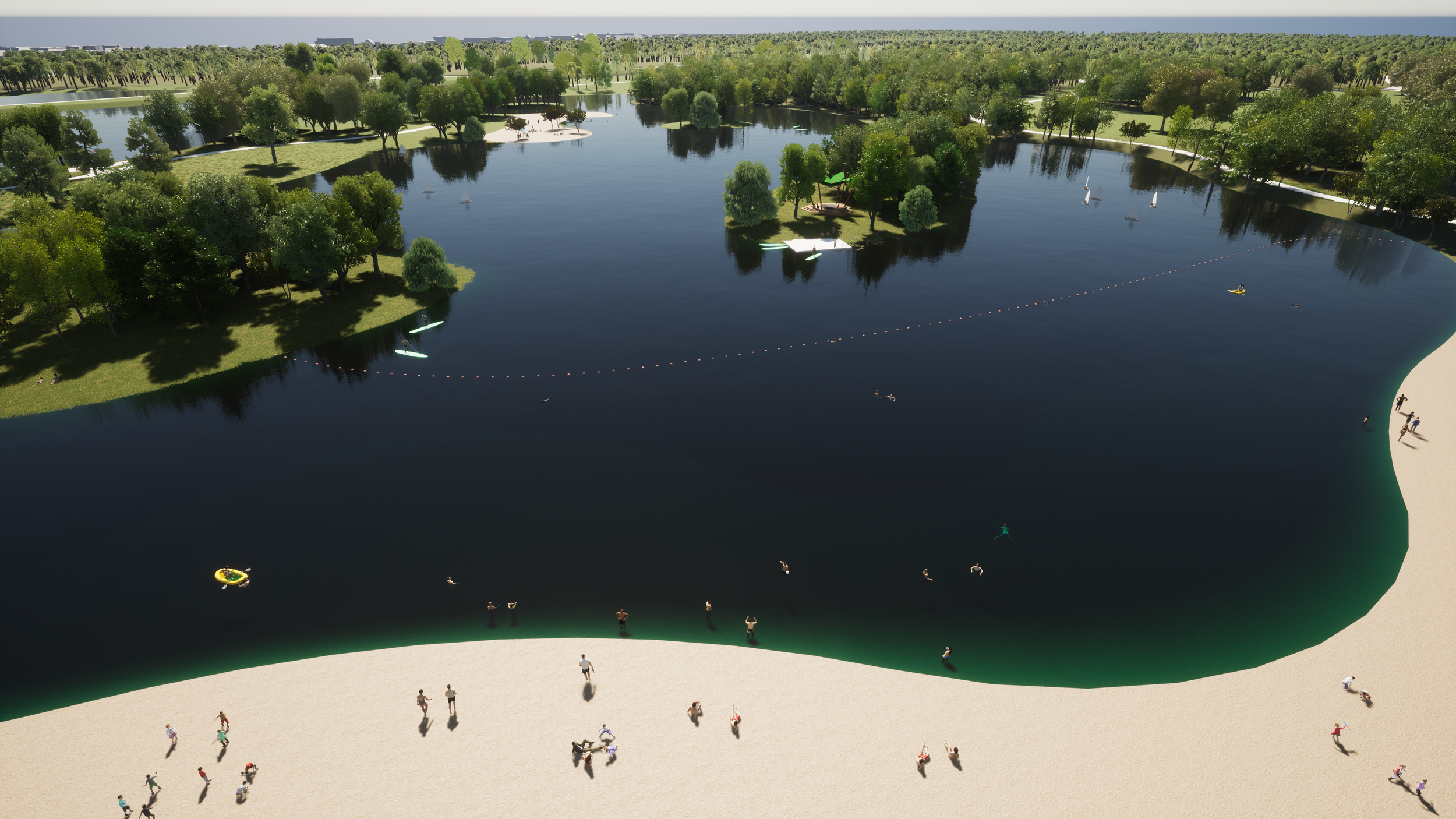 Bestaande en nieuwe toestand met achteraan de transformatie van landingsbaan tot watersportbaan en centraal het groot meer met wandelboulevard, stranden en ruimte voor waterrecreatie. De bestaande gebouwen kunnen omgevormd worden tot atelier, horeca of zeil- en roeiclub.